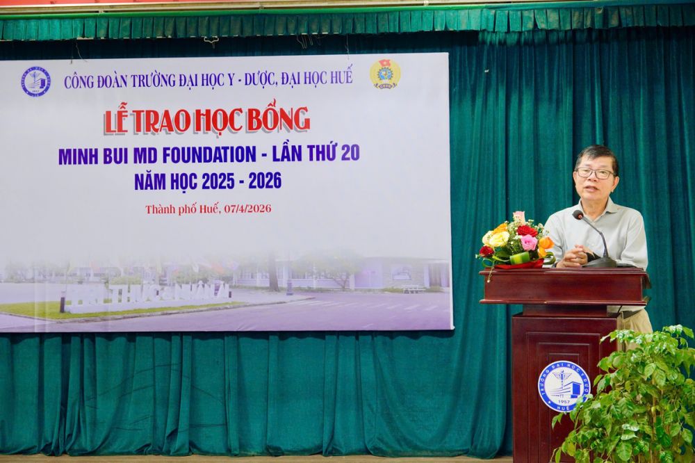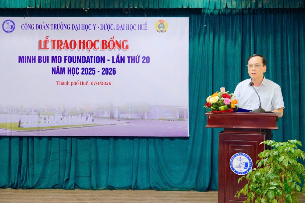 Phát biểu tại buổi lễ, PGS. TS. Đặng Công Thuận - Phó Chủ tịch phụ trách Công đoàn Trường bày tỏ lòng biết ơn sâu sắc đối với sự đồng hành bền bỉ của GS. Bùi Văn Minh trong suốt hai thập kỷ qua. Đây không chỉ là nguồn hỗ trợ về mặt vật chất mà còn là điểm tựa tinh thần to lớn, tiếp thêm nghị lực cho sinh viên trên con đường chinh phục tri thức. Học bổng Minh Bui MD Foundation là một trong những nguồn học bổng lớn, minh chứng cho truyền thống "uống nước nhớ nguồn" và sự gắn kết giữa các thế hệ thầy thuốc. PGS. TS. Đặng Công Thuận cũng nhắn nhủ các em sinh viên được nhận học bổng cần trân trọng vinh dự này, không ngừng rèn luyện y đức và chuyên môn. Thầy hy vọng sau khi trưởng thành, sinh viên sẽ là những người tiếp nối ngọn lửa nhân ái đóng góp cho cộng đồng, xã hội.